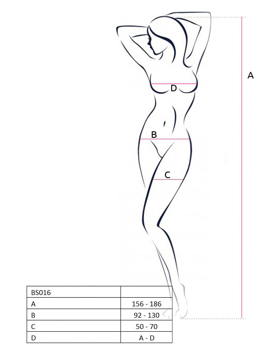 Ovaj seksi bodystocking savršeno prati linuju tela, naglašavajući ženstvene obline. Poseduje prorez između nogu. Ovaj bodystocking dostupan je u jednoj univerzalnoj veličini i neodoljiva su kombinacija prefinjenosti i zavodljivosti,. Izrađen je od visokokvalitetnih materijala – 80% poliamid i 20% elastina, obezbeđujući udobnost i rastegljivost koja omogućava da se savršeno prilagodi vašem telu. Univerzalna veličina S-L garantuje da će se savršeno pristajati na svaku figuru.