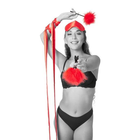 Ništa ne govori „Hoćeš li biti moj/moja?“ kao Amor Bondaž komplet za početnike. Preuzmite kontrolu nad scenom pomoću glatkih satenskih vezica i satenskog poveza za oči. I sigurno ćete zagolicati maštu svog partnera uz mekane stezaljke za golicanje i mekane stezaljke za bradavice.