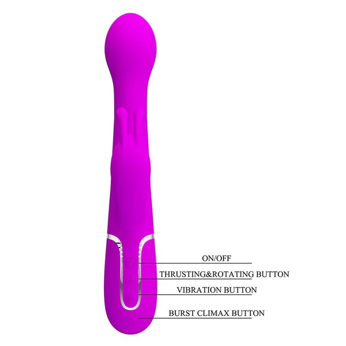 Ljubičasti Dejon vibrator, sa dodatkom za klitoris u obliku zeca, rotirajući i potiskujući 3 u 1, iz kolekcije Twinkled Tenderness kompanije Pretty Love, je inovativni uređaj za zadovoljstvo dizajniran da podigne vaše intimne trenutke na nove visine. Ovaj elegantni i svestrani trostruki stimulator ima dizajn sa dvostrukim dejstvom za ciljanu stimulaciju G-tačke i klitorisa, nudeći uživanje. Napravljen od vrhunskih materijala bezbednih za telo, višefunkcionalni zec pruža baršunasto glatku teksturu na vašoj koži, dodajući dašak luksuza vašim seansama zadovoljstva. Istražite 7 moćnih režima vibracije, 4 rotacije i 4 funkcije potiska sa svojim intuitivnim kontrolama, omogućavajući vam da prilagodite svoje senzualno putovanje. Ukupna dužina vibratora je 22.6cm, a prečnik iznosi 3.7cm. Penetrirajući deo ima dužinu od 14cm. Preporučujemo upotrebu lubrikanta na vodenoj bazi.