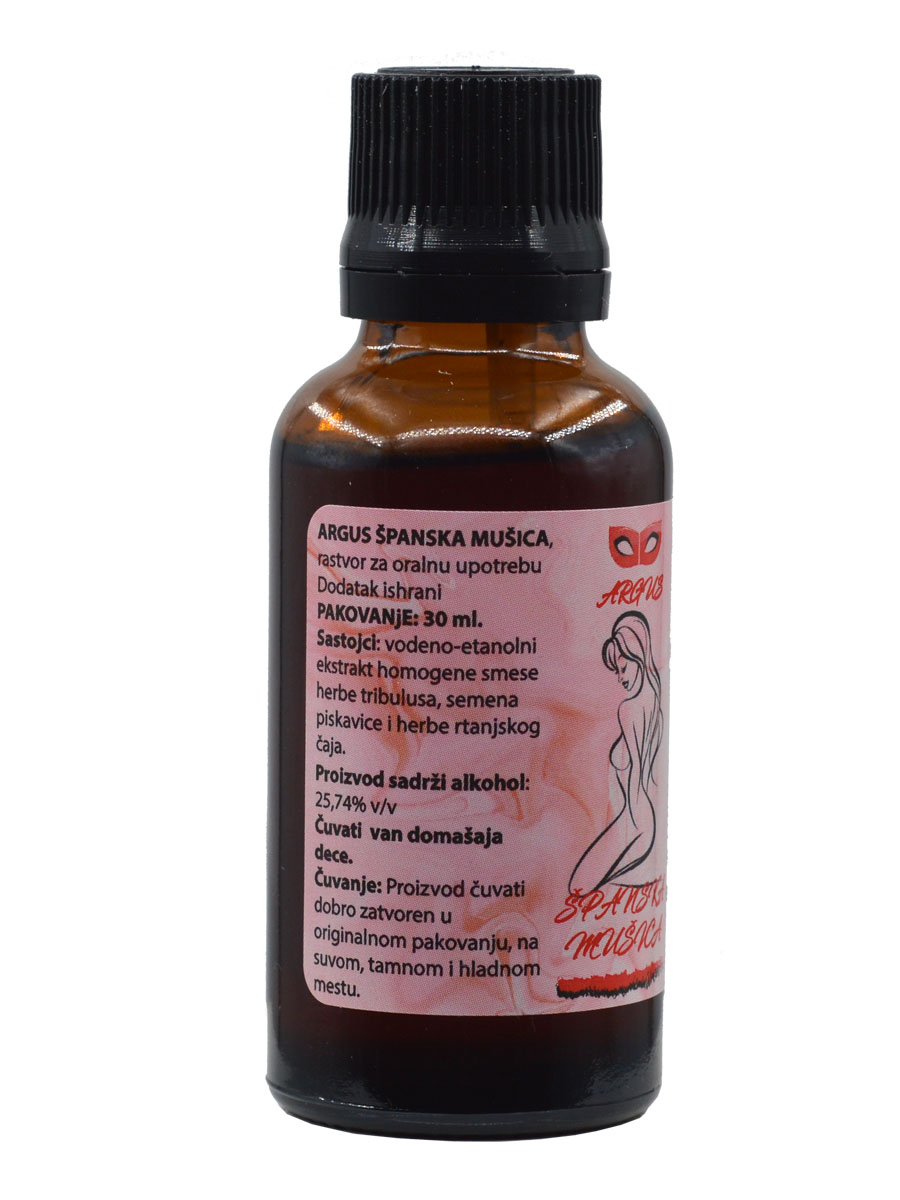 Ako želite da probate nešto novo i da pospešite Vaš seksualni odnos probajte ovaj naš novi proizvod na prirodnoj bazi sa akcentom na probranim potpuno prirodnim sastojcima.Španska mušica je dodatak ishrani na bazi ekstrakta homogene smese herbe tribulusa,semena piskavice i herbe rtnjaskog čaja.piskavica povećava tonus,poboljšava opšte stanje i smanjuje slabost organizma.Tribulus pomaže zdravlje polnih organa i hormonsku aktivnost,povećava seksualnu želju i sposobnost.
