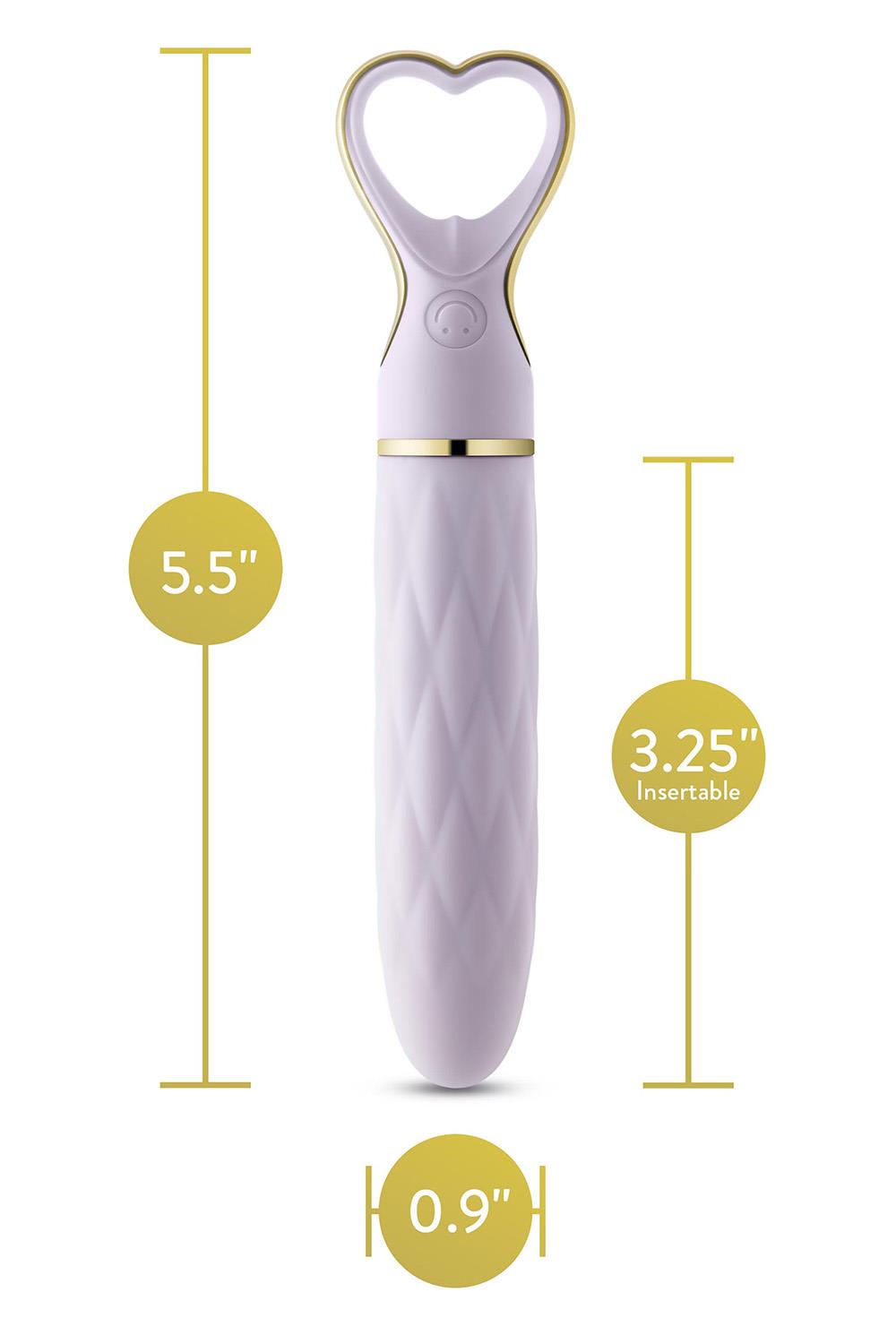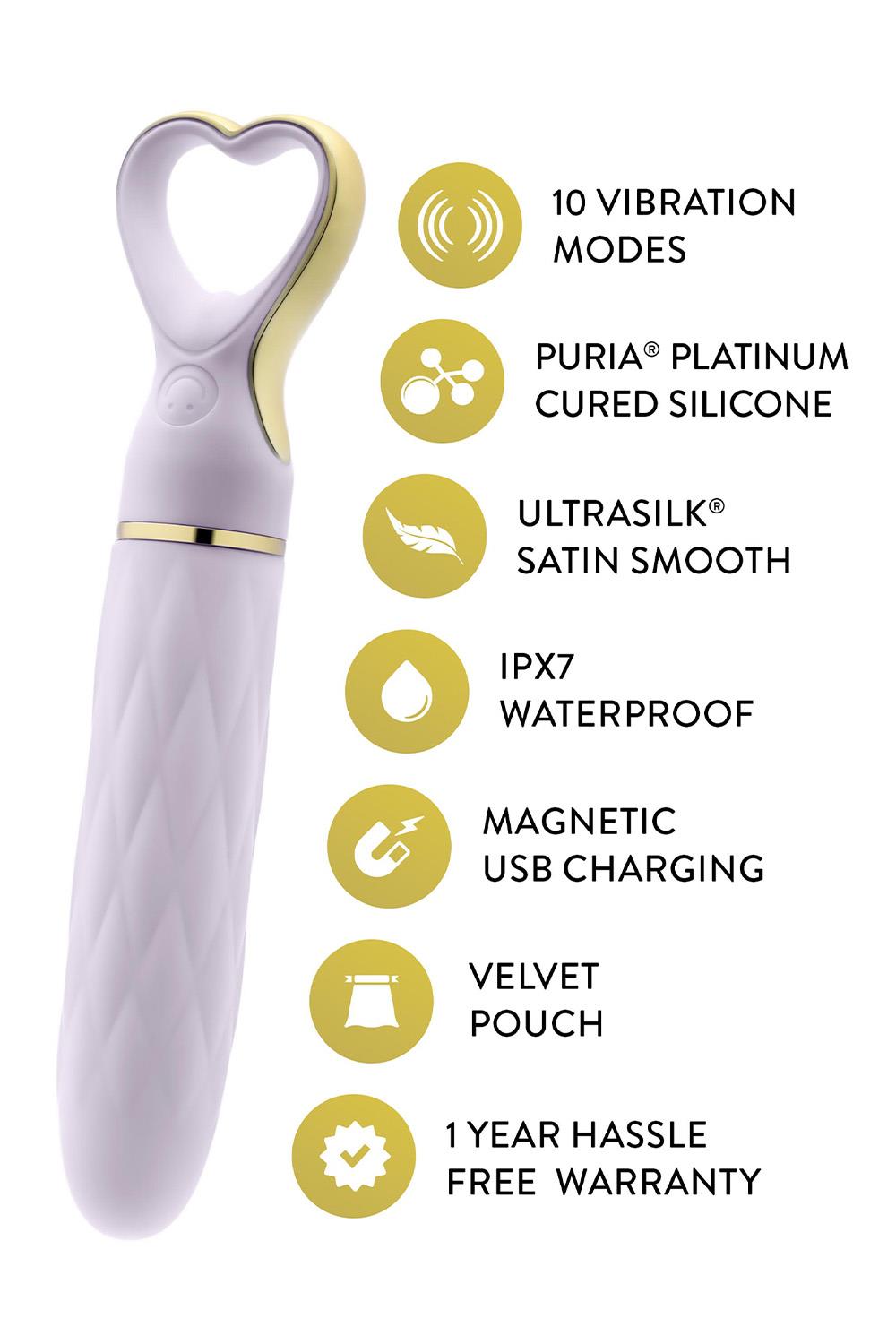 Slatki, šik i sofisticirani, Delice Heartthrob je vibrator dizajniran da razmazi vaša čula. Njegov glatki, suženi vrh pruža ciljanu, preciznu stimulaciju, sa 10 raznovrsnih režima vibracije - uključujući 5 brzina i 5 obrazaca - kako biste istražili svoje zadovoljstvo, sve na dohvat ruke. Napravljen od vrhunskog, platinasto očvrslog silikona Puria®, bezbednog za telo, sa luksuznom UltraSilk® završnom obradom, Heartthrob je neodoljivo mekan i nežan na koži. Drška u obliku srca, ukrašena zlatom, dodaje dašak elegancije vašem vremenu za igru. Otporan na prskanje i magnetni USB punjiv, ovaj vibrator osigurava da je vaše zadovoljstvo uvek nadohvat ruke. Punjenje se preporučuje preko laptopa. Prelepo dizajniran za samostalno uživanje ili kao pažljiv poklon, lagani i spremni za putovanja, Heartthrob je savršen pratilac gde god da vas strast odvede. Preporučujemo upotrebu lubrikanta na vodenoj bazi. Ukupna dužina proizvoda je 14cm, a dužina za umetanje je 8.3cm. Širina iznosi 2.3cm.