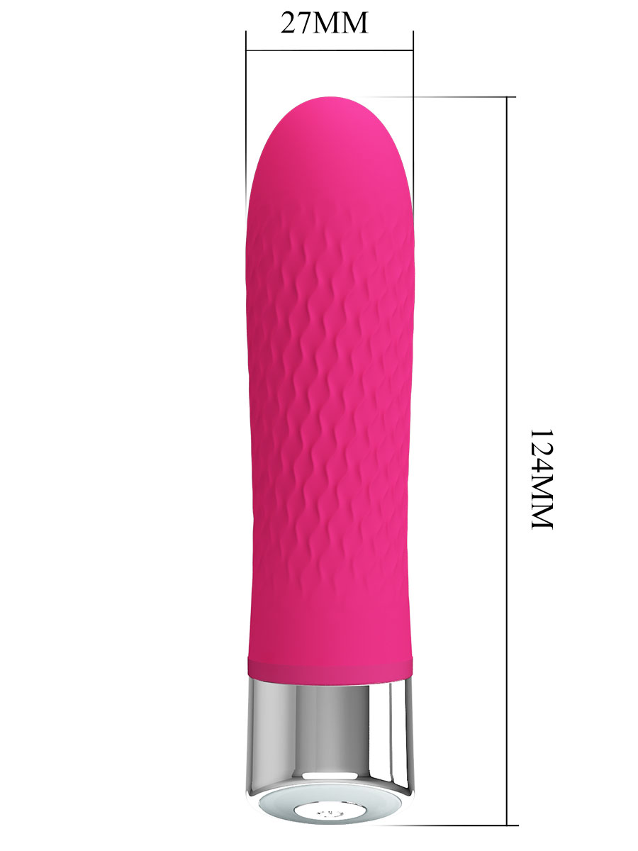 Ovaj vibrator pruža neverovatno prijatnu stimulaciju kombinovanjem ultra intenzivnih vibracija sa pametno oblikovanim dizajnom. Napravljen od elitnog silikona sa poliranom plastičnom bazom, ovaj vibrator je gladak, sofisticiran i ima 12 moćnih vibrirajućih šablona. Dužina 12,4cm i prečnik oko 2,7cm.Može se lako poneti sa sobom gde god da idete i poslužiti u svakoj prilici.Ima izuzetno jaku i tihu vibraciju.Koristi 1AA bateriju i vodootporan je.